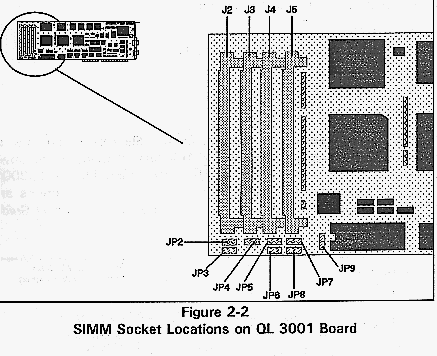The QL 3001 board's RAM resides in 30pin SIMMs. To add memory, install standard SIMMs or Cubix SIMMs in sockets J2 through J5, and set jumpers JP2 through JP8 to match the memory configuration. Figure 2-2 shows the SIMM sockets and jumpers.