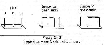Figure 2-3 shows jumpers and pins on a jumper block. (Jumper JP9 is a manufacturing test jumper. A jumper should be on pins 12 of JP9 for normal operation.)