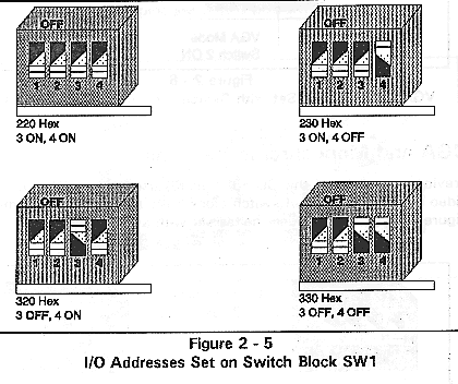 Each QL 3001 board houses a four position DIP switch (SW1). Switches 3 and 4 of SW1 select the base I/O address used by the server driver to communicate with the QL 3001 processors. The QL interface requires eight consecutive I/O ports beginning with the base I/O address.