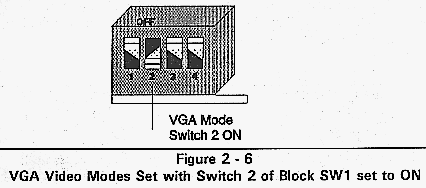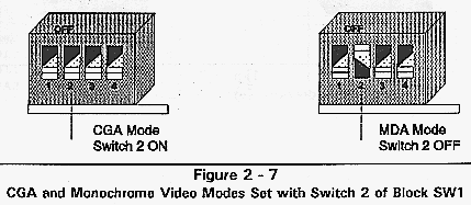 Previous revisions of the QL 3001 board used either MDA or CGA video mode. Switch 2 of switch block SW1 selects the video mode. Figure 2-7 shows the video modes set with switch block SW1.