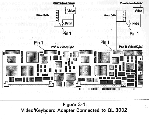 2. Connect one end of the 14pin ribbon cable to the video/keyboard mux header for the appropriate processor on the QL 3002 board (refer to Figure 3-4). The pin-one side of the ribbon cable is marked with a colored (blue or red) stripe. Pin one on the QL 3002 is on the left side of the header when the edge connector is down. Align the pin-one side of the ribbon cable with pin one on the header.