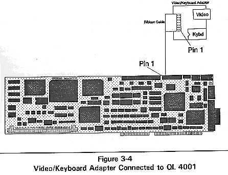 2. Connect one end of the 14pin ribbon cable to the video/keyboard mux header on the QL 4001 board (refer to Figure 3-4). The pin-one side of the ribbon cable is marked with a colored (blue or red) stripe. Pin one on the QL 4001 is on the left side of the header when the edge connector is down. Align the pin-one side of the ribbon cable with pin one on the header.
