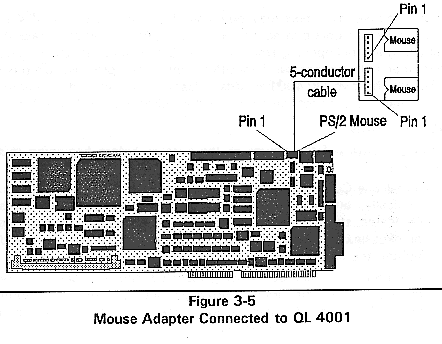 2. Connect one end of the 5-conductor cable to the PS/2 mouse header on the QL 4001 board. Pin numbers one through five are indicated on the cable connector. Align pin one of the cable connector with pin one on the header.