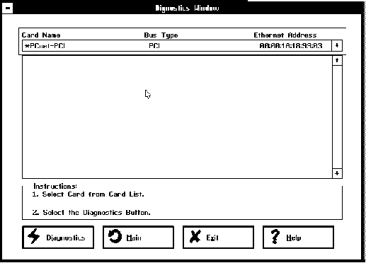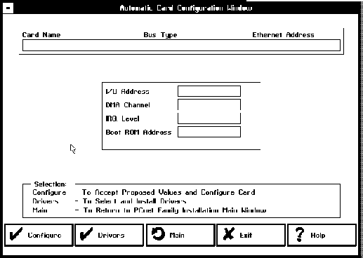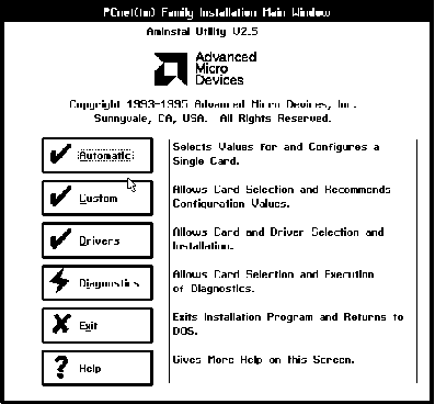 The PCnet Family Installation Main Window has the following six button selections: Automatic, Custom, Drivers, Diagnostics, Exit, and Help. Before the Main window appears, the utility searches for a PCnet adapter card in the system. If one is not found, an error screen is displayed telling the user to install the adapter card before using the utility. If only one Ethernet card is found and a conflict-free configuration is determined, the Automatic, Custom, and Drivers buttons are enabled. If more than one card is found or the configuration has conflicts, only the Custom and Drivers buttons are enabled.
