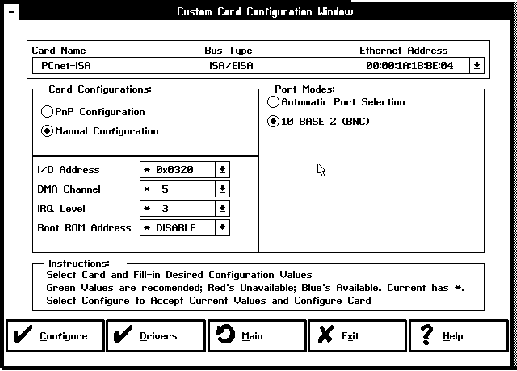 PCnet-ISA+ (or PCnet-ISA II) adapter card in manual mode Bus Type Ethernet address I/O Address DMA Channel IRQ Level Port Mode Boot ROM