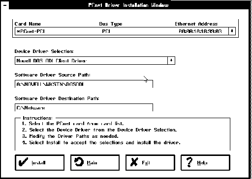 The PCnet Driver Installation Window of the AMINSTAL utility can be used to install the following drivers: