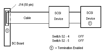 Note: Termination should also be configured as "enabled" if the SCSI interface is not used. The last device on the SCSI cable must also supply a termination load to the cable. SCSI devices not at the end of the cable must have their termination loads disconnected. Enabling and disabling a SCSI device's termination may involve a switch or shunt setting or the installation or removal of resistive SIP or DIP packages on their circuit board. Consult the installation manual for the SCSI device to determine its termination options.