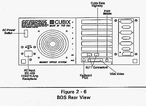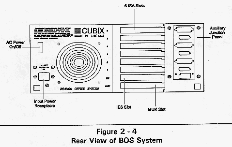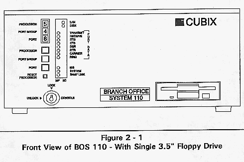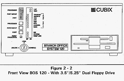 The Cubix Branch Office System contains an ISA 6 slot passive backplane divided into groups. A group consists of either a single PC slot or a series of PC slots connected together. Also included is a disk drive bay capable of housing five 3.5" disk drives. Since the backplane is a standard ISA component, PC-compatible boards (such as network interface controllers) are supported. With a Cubix BC Series bus controller card and NIC installed in each group, the BOS System provides multiple networked workstations. The number of workstations and expansion slots depends upon the configuration of the 6-slot backplane. For example, the 6slot segmented backplane can be configured to have three groups of PC slots with each group containing two slots. With a BC Series board installed in each group, this is functionally equivalent to three AT-class computers, each with one expansion slot.