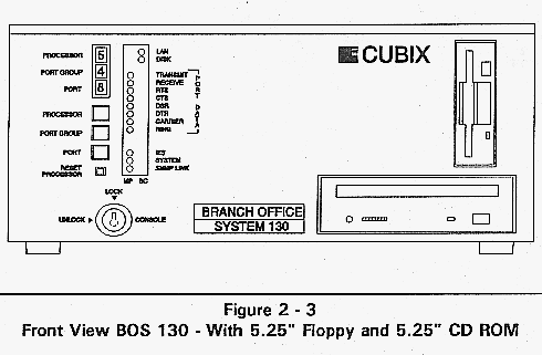 * The Multiplexor/Front Panel permits the system BC processors to share a VGA monitor, keyboard, mouse, floppy disk drive, and reset pushbutton. The panel also permits Cubix multiport adapters to share LEDs indicating serial port status, and BC processors to share LEDs indicating processor status. It also displays IES module status.