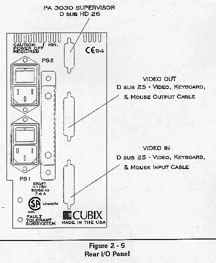 Multiple MultiServ/FT Subsystems installed in a Cubix System 1010 cabinet can be connected together in a daisy-chained fashion allowing single keyboard, video, and mouse devices to be shared among subsystems. To accommodate this requirement, the System 1010 is equipped with a Video/keyboard/mouse interface module located on the upper right rear rail. The monitor, keyboard, and mouse devices are connected to this interface module, which in turn is connected to the daisy-chain of MultiServ/FT Subsystems.
