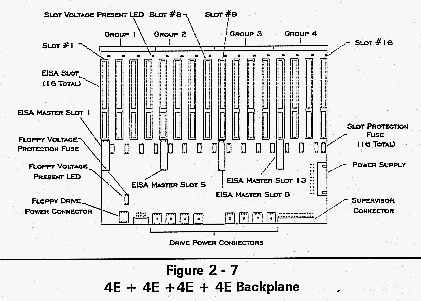 Figure 2-7 shows the MultiServ/FT EISA backplane with four groups of 4 EISA slots each (4E + 4E + 4E + 4E).
