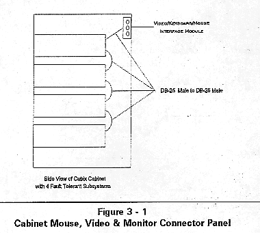 1. Connect the Cubix supplied DB-25 cable on the rear of the MultiServ/FT Subsystem to the plug labeled "VIDEO OUT". Connect the other end to the free standing or to the Cabinet mounted video, keyboard, mouse interface module.