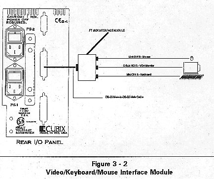 2. Connect a VGA monitor, keyboard, and mouse to the Video/Keyboard/Mouse Interface Module. (See next section for a detailed explanation.)