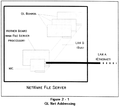 Nodes (workstations and file servers) on NetWare networks are identified by a net number and a node number, or address. QL workstations residing within a single server or router function as nodes on their own network segment with their own unique network address. These network segments are typically referred to as LAN A, LAN B, etc. using Novell terminology. Each QL workstation is assigned a unique node address on the network segment. Node numbers are assigned to QL workstations using DIP switches on the boards as explained during the installation instructions. The net address will be the same number specified when the Cubix driver is bound to the protocol (e.g. IPX). Refer to Figure 2 - 1 for an illustration of network addressing.