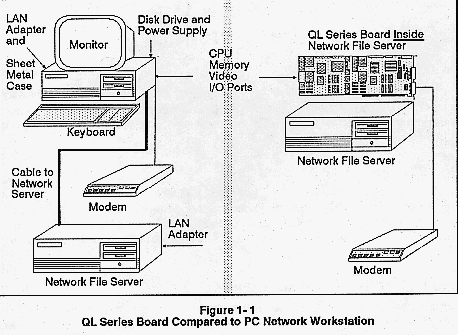 Figure 1-1 shows the main hardware differences between a regular PC network workstation and a QL Series board. Each product is set up with a modem for dial-in communications. You will notice the main difference: the QL Series Board lacks most of the hardware of the PC workstation: