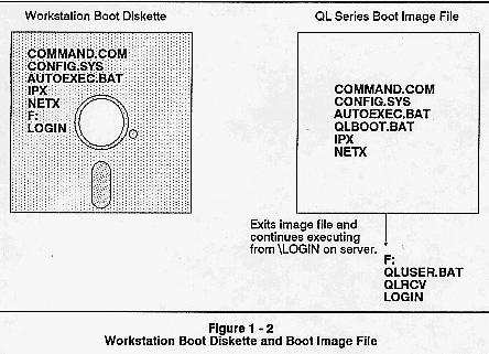 Figure 1-2 shows the difference between a Boot Diskette for a regular workstation and the Boot Image File for a QL series board processor. Both accomplish the same results - they boot up their workstation, connect it to the server, and display the Novell LOGIN prompt.
