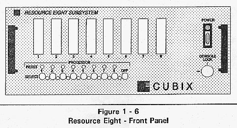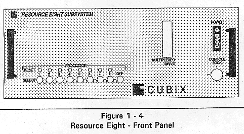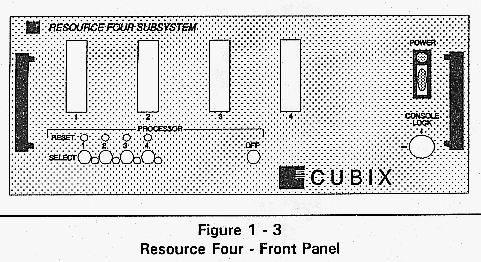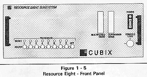 The front panel of the Cubix Resource Subsystem provides a Power On indicator, subsystem power switch, select buttons, a key lock switch, one or more processor reset buttons, and access to one or more diskette drives.