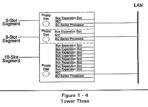 The LCS Tower consists of a desk-side enclosure with a 16-slot standard ISA or EISA passive backplane divided into segments. Also included is a disk drive bay capable of housing at least one 3.5" third height disk drive per segment. Since the backplane is a standard component, it supports PC-compatible boards such as network interface controllers (NICs). With a BC Series card and a NIC inserted into each segment, the LCS Tower can provide multiple network workstations in a single enclosure.