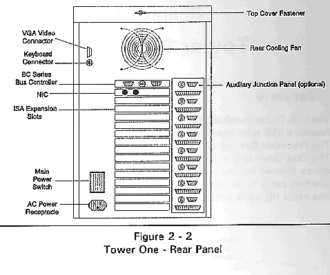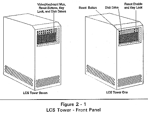 The LCS Tower consists of four main sections. The Power Supply Bay houses a 350 watt power supply which provides power to the Tower. The Processor Bay contains the 16-slot segmented passive backplane. The Disk Drive Bay will support up to the maximum number of disk drives defined for the particular Tower configuration. The auxiliary junction panel is an option which provides a means to bring parallel and serial I/O ports to the rear of the Tower.