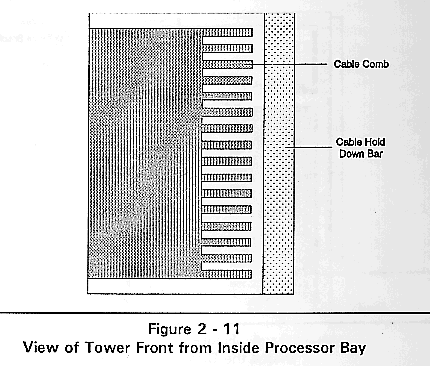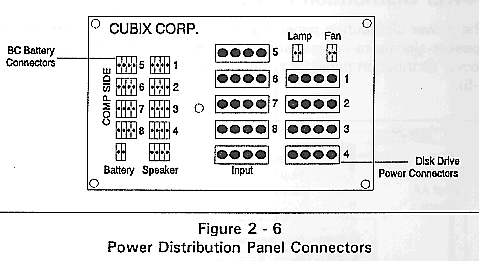 The Disk Drive Bay contains the power distribution panel, the Tower disk drives, and optionally a Cubix video/keyboard multiplexor.