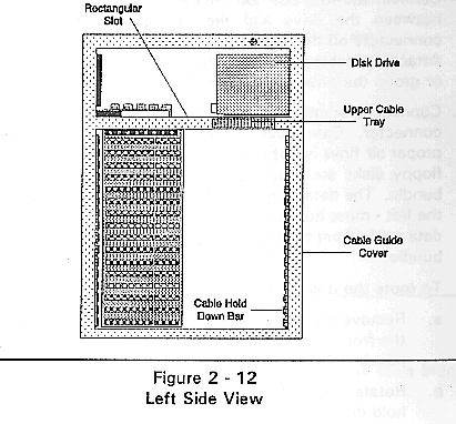 10. Connect a standard AT floppy data cable to the floppy drive connector. Care must be taken to route this data cable so that proper air flow is not restricted. The drive data cables from the floppy disks are routed to the left side of the Tower in a neat bundle. The data cables are arranged so that the data cable from the left - most floppy drive (#1) is in the front of the bundle. The data cable from the right - most floppy drive is at the rear of the bundle.