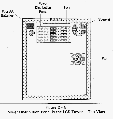 The power distribution panel provides disk drive power, battery, and speaker signals to components within the LCS Tower. Access the power distribution panel by removing the top cover (refer to Figure 25.).