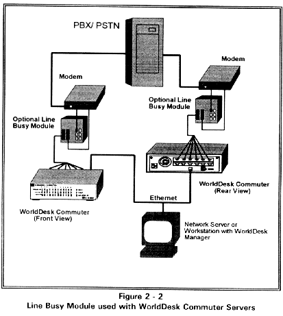 WorldDesk Servers within a cluster continually monitor each other to detect server failures in the cluster. If a server failure is detected, another server in the cluster assumes responsibility for the session. Within the cluster, each remote node session is represented by the media access control (MAC) address assigned to the session. Using the cluster icon*s address list, it is possible to see which server in the cluster is currently responsible for any given remote node session. The Cubix Line Busy module may be used in conjunction with WorldDesk servers to ensure that the modems connected to a server that becomes unavailable (due to either hardware or power failures) are busy. Forcing the line to be busy causes calls to be automatically routed to servers that are functional. Figure 2 - 2 illustrates the six-port line busy module used with Commuter. An eight-port line busy module is also available for Comlink support. To learn more about the eight-port version, refer to DOC 776, MP Series Multiport Boards Installation Guide. The six-port version is discussed in DOC 811, WorldDesk Commuter Hardware Installation Guide.