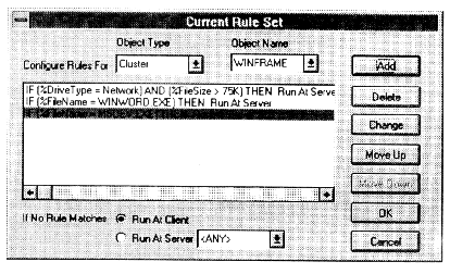 The rules database is administered via the WorldDesk Manager program. To invoke the rules editor, select the "Configure Rules" option within the Cluster pull-down menu.