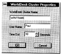 When connecting to a server within the selected cluster, the client user must be authenticated to determine if the user has "Start Sessions" permission. Initially, the user name entered is used in the authentication request. The user is prompted at runtime for password or DES challenge/response if necessary. For more information on WorldDesk security, turn to Chapter 7.